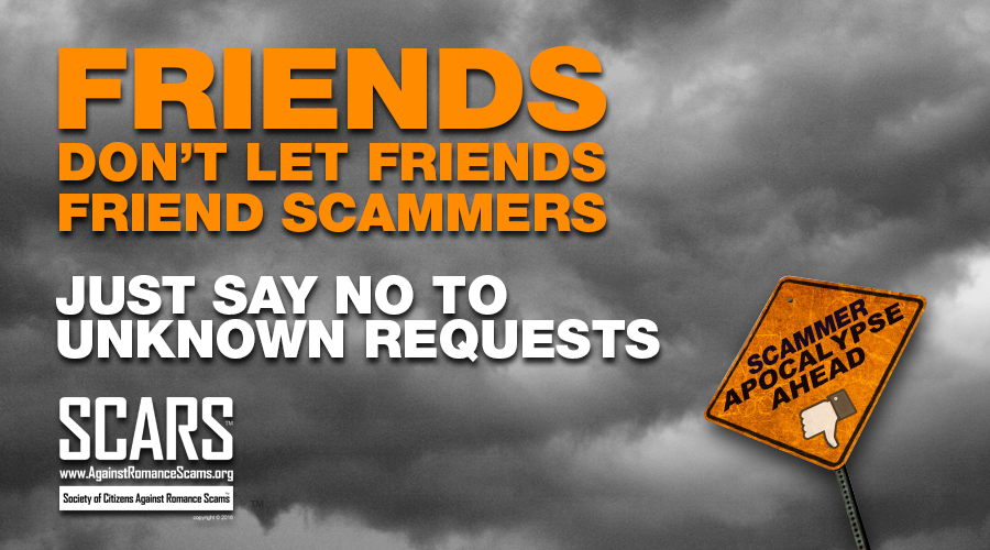 All original content is Copyright © 1991 – 2018 SCARS All Rights Reserved Worldwide & Webwide – RSN/Romance Scams Now & SCARS/Society of Citizens Against Romance Scams are all trademarks of Society of Citizens Against Romance Scams Inc.
