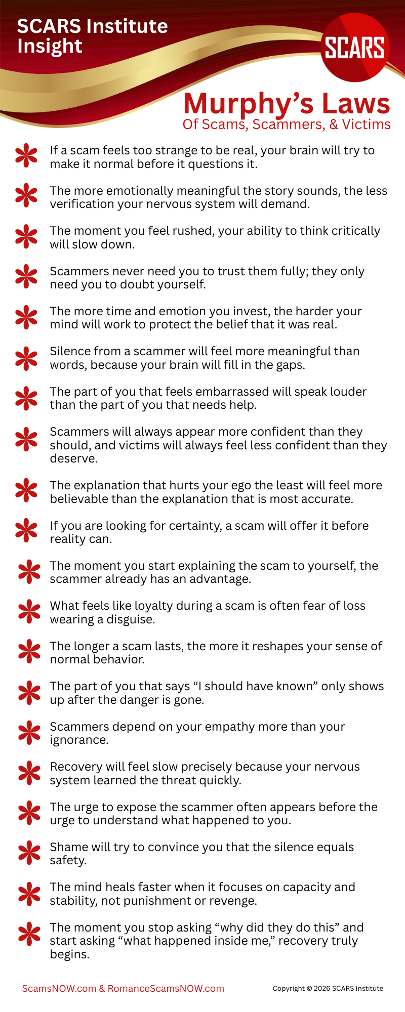 These “laws” describe patterns, not flaws. They show how quickly the nervous system learns threat and how slowly it may relearn safety, especially after a relationship scam or prolonged manipulation. The goal is not to replay the past or punish yourself for being human. The goal is to rebuild trust in your perception, strengthen your capacity to pause and verify, and reduce the shame that keeps victims silent. When you treat your reactions as understandable survival responses, you create space for stable recovery. The turning point often arrives when attention shifts away from the scammer’s motives and toward the internal experience that made the scam believable, tolerable, and hard to release. That is where clarity grows, and where lasting safety begins.