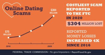 Far be it from us to put a damper on Valentine’s Day, but reports to the FTC’s Consumer Sentinel Network suggest that the injury inflicted by romance scams is on the rise. According to the new Data Spotlight, “For three years running, people have reported losing more money on romance scams than on any other fraud type identified in Sentinel. In 2020, reported losses to romance scams reached a record $304 million, up about 50% from 2019. For an individual, that meant a median dollar loss of $2,500.”