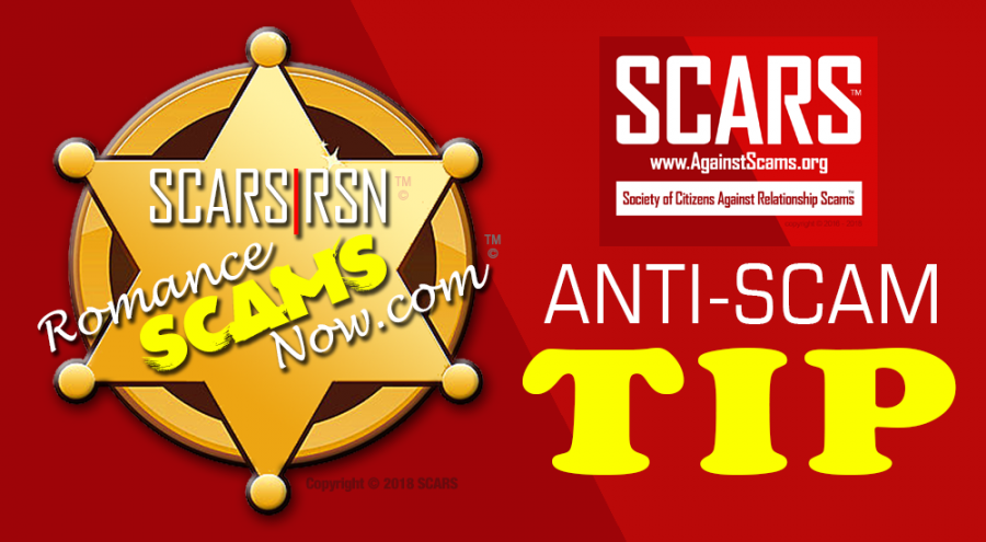 All original content is Copyright © 1991 – 2018 SCARS All Rights Reserved Worldwide & Webwide – RSN/Romance Scams Now & SCARS/Society of Citizens Against Romance Scams are all trademarks of Society of Citizens Against Romance Scams Inc.